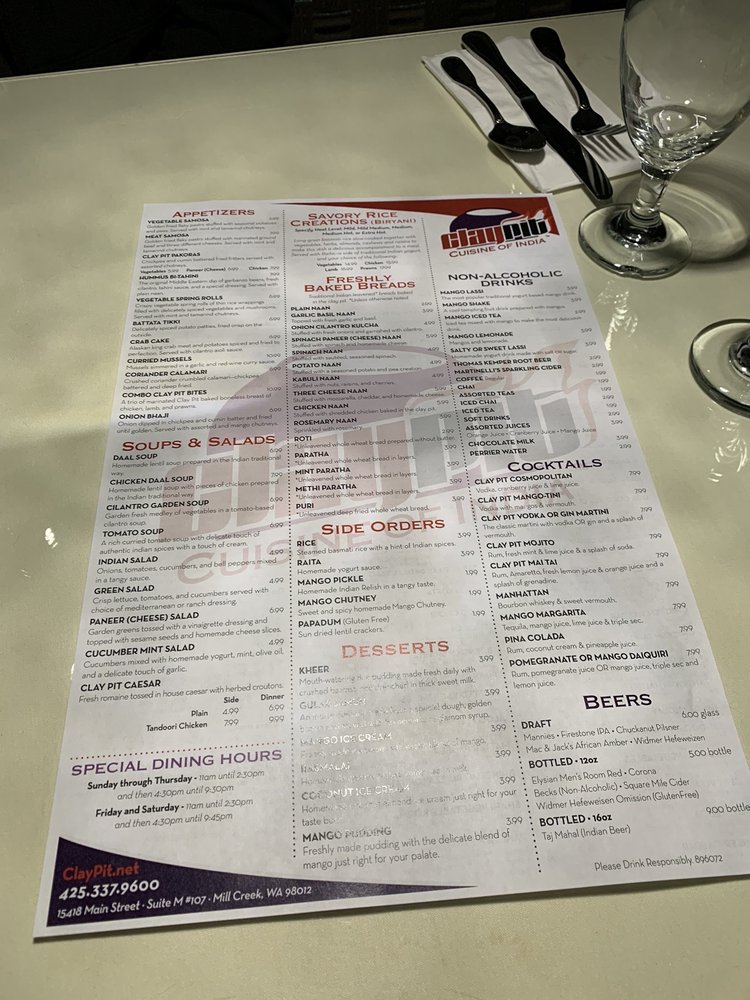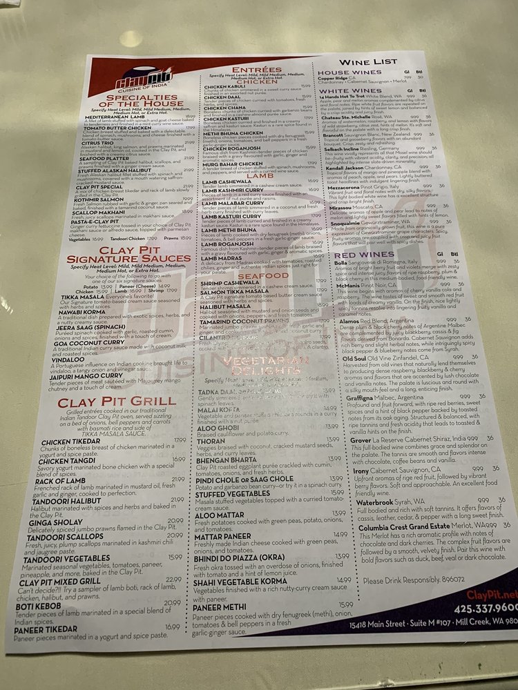 Introducing the menu at Clay Pit, a hidden gem located in Mill Creek, WA. This casual yet inviting restaurant offers a wide range of options for every palate. With vegan and vegetarian options aplenty, along with delicious meat dishes like the mango chicken and Lamb Kasturi, there is something for everyone. The welcoming staff under new management have brought a friendly atmosphere, making dining in a delightful experience. The return of the lunch buffet is a hit among patrons, allowing guests to sample a variety of menu items. The food is flavorful, the service is impeccable, and the ambiance is calming. Don't miss out on trying the Tikka Masala, Vindaloo, Gobi Pakora, and Kabuli Naan - all dishes that will leave you craving more. Clay Pit is a must-visit for anyone looking for a top-notch Indian dining experience.